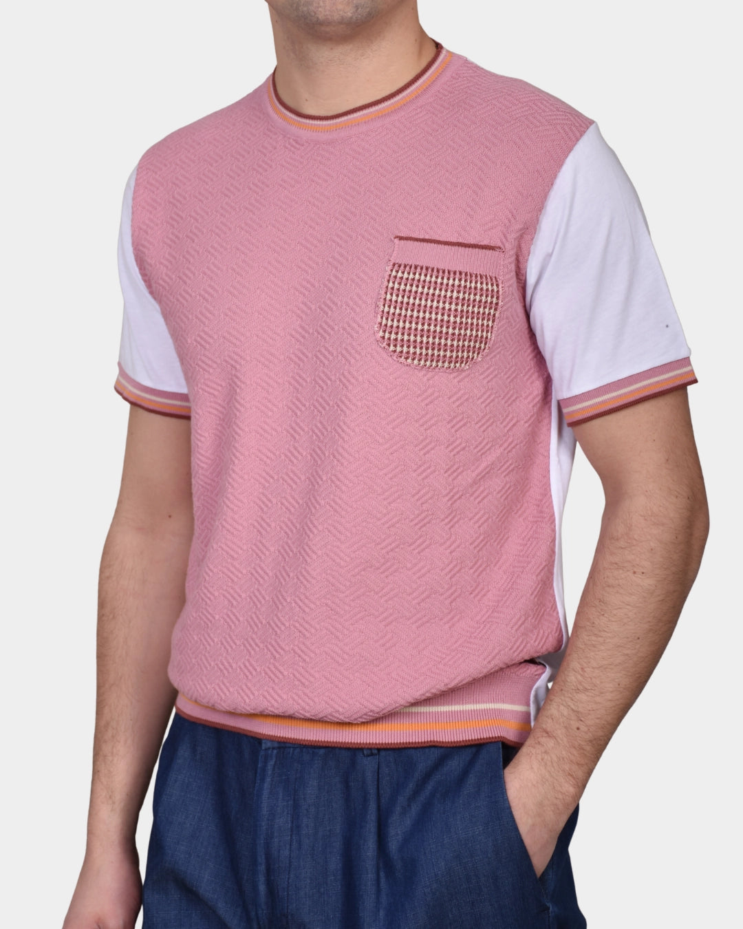En t-shirt med tydlig karaktär där den stickade fronten ger struktur och djup, balanserad av släta ärmar för ett rent och modernt uttryck. Diskreta färgdetaljer i krage och ärmslut ger en genomtänkt och personlig finish.